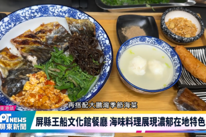 屏東縣王船文化館餐廳,近期推出多款海味套餐,除了經典款的超澎派海鮮飯湯,搭配櫻花蝦、旗魚黑輪、雙糕潤的組合,也...