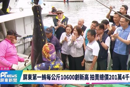 台灣、屏東第一鮪上午在東港魚市場舉行拍賣會,由屏東縣長周春米與藝人小禎共同擔任拍賣官,喊價競爭激烈,最後由佳珍...
