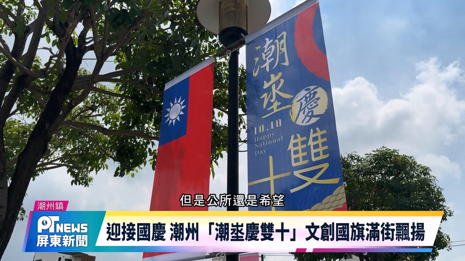 為迎接雙十國慶,潮州鎮公所在鎮內主要道路及觀光景點,均掛滿「潮埊慶雙十」文創國旗,公所期盼以新穎的國旗設計,讓鄉親朋友重新回味50、60年代的國慶記憶,同時祝福國家生日快樂。