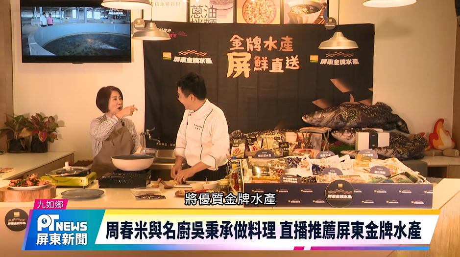 為行銷屏東優質水產品,屏東縣長周春米邀請知名型男主廚吳秉承,進行「金牌水產.屏鮮直送」電商直播,在直播中除了介紹縣府嚴選出的「屏東金牌水產」特色,也示範如何料理泰國蝦和石斑魚,鼓勵觀眾踴躍訂購,把產地直送的新鮮滋味直接帶回家。