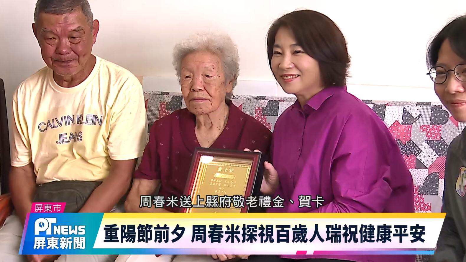 Home / 新聞 / 重陽敬老 周春米探視百歲人瑞祝健康平安新聞重陽敬老 周春米探視百歲人瑞祝健康平安2025-10-23 屏東縣老年人口占全縣總人口的21.51%,其中90歲以上的長者達6,500人,包括145位百歲人瑞。在重陽節前夕,屏東縣長周春米特別前往屏東市崇大新城,探視屏東市百歲人瑞蔡素英,透過慰訪活動,讓長輩感受到社會的關懷與敬意。 Share this ArticlePrevious Article防綠鬣蜥啃食嫩葉 屏縣推紅豆田圍網補助Next Article屏縣防堵非洲豬瘟 全面稽查使用廚餘養豬場ju.yin Related Posts 《從容也很Real》屏警發表交通安全宣導歌曲 2025-10-23 首度試辦 內埔鄉公所推「農村文化食農小旅行」 2025-10-23 內埔韓愈文化祭 帶民眾沉浸式感受客家生活美學 2025-10-23 Leave a Reply 取消回覆發佈留言必須填寫的電子郵件地址不會公開。 必填欄位標示為 *Comment顯示名稱 * 電子郵件地址 * 個人網站網址 在瀏覽器中儲存顯示名稱、電子郵件地址及個人網站網址,以供下次發佈留言時使用。
