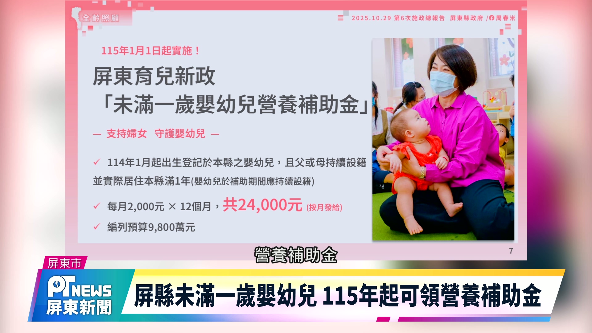 屏東縣長周春米在縣議會施政總報告時祭出育兒新政,宣布自115年1月起將推動「未滿一歲嬰幼兒營養補助金」,每名嬰幼兒可獲得最高2萬4000元補助,希望提供更全面的育兒支持,減輕新生兒家長的育兒負擔,並鼓勵生育。