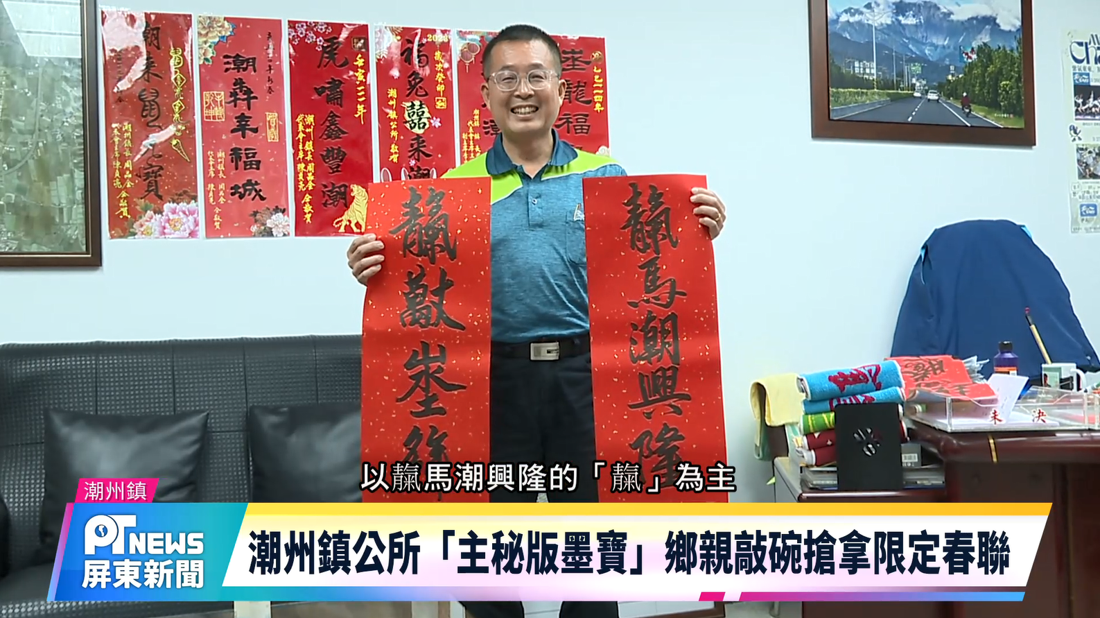 Home / 新聞 / 潮州鎮公所「主秘版墨寶」鄉親敲碗搶拿限定春聯新聞潮州鎮公所「主秘版墨寶」鄉親敲碗搶拿限定春聯2025-11-04 潮州鎮公所每年由主秘王建元所發想的吉祥話春聯,連年受到鄉親喜愛,繼去年「埊龍福聚潮」後,今年主秘更以「靝馬潮興隆」發想,寫下珍貴墨寶預計在新年度千人揮毫時送出,不料尚未到時間就有鄉親敲碗想拿! Share this ArticlePrevious Article屏縣府新建恆春體育館 整合周邊做運動、展演多元場域ju.yin Related Posts 屏縣府新建恆春體育館 整合周邊做運動、展演多元場域 2025-11-04 縣府補助各公所資收車及垃圾車共38輛 提升清運效率 2025-11-04 屏東第九家公共托育機構 華山公設民營托嬰中心開幕 2025-11-04 Leave a Reply 取消回覆發佈留言必須填寫的電子郵件地址不會公開。 必填欄位標示為 *Comment顯示名稱 * 電子郵件地址 * 個人網站網址 在瀏覽器中儲存顯示名稱、電子郵件地址及個人網站網址,以供下次發佈留言時使用。
