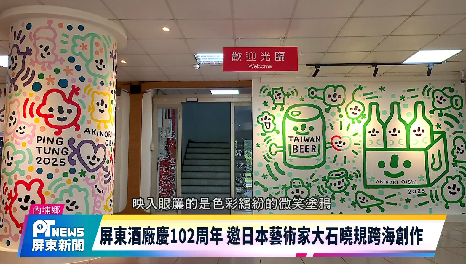 Home / 新聞 / 屏東酒廠慶102周年 邀日本藝術家大石曉規跨海創作新聞屏東酒廠慶102周年 邀日本藝術家大石曉規跨海創作2025-11-05 日本知名藝術家大石曉規受邀至屏東酒廠駐村創作,在推廣中心彩繪他知名「Aki宇宙」的笑臉小人,藝術家創作特別加入台酒元素,把台灣啤酒、米酒和「燒酒」以趣味可愛的塗鴉風格呈現,為這百年酒廠注入全新活力與面貌。 Share this ArticlePrevious Article復振馬卡道族文化 老埤社區重現捕魚技術「下跳椼仔」Next Article屏東社區創意接連奪國內外大獎 縣府盼更多夥伴加入ju.yin Related Posts 潮州民治溪護岸親水空間 成鄉親散步休閒好去處 2025-11-05 竹田鄉長遭停職 屏縣府派文化處副處長方慧茹代理 2025-11-05 屏東社區創意接連奪國內外大獎 縣府盼更多夥伴加入 2025-11-05 Leave a Reply 取消回覆發佈留言必須填寫的電子郵件地址不會公開。 必填欄位標示為 *Comment顯示名稱 * 電子郵件地址 * 個人網站網址 在瀏覽器中儲存顯示名稱、電子郵件地址及個人網站網址,以供下次發佈留言時使用。