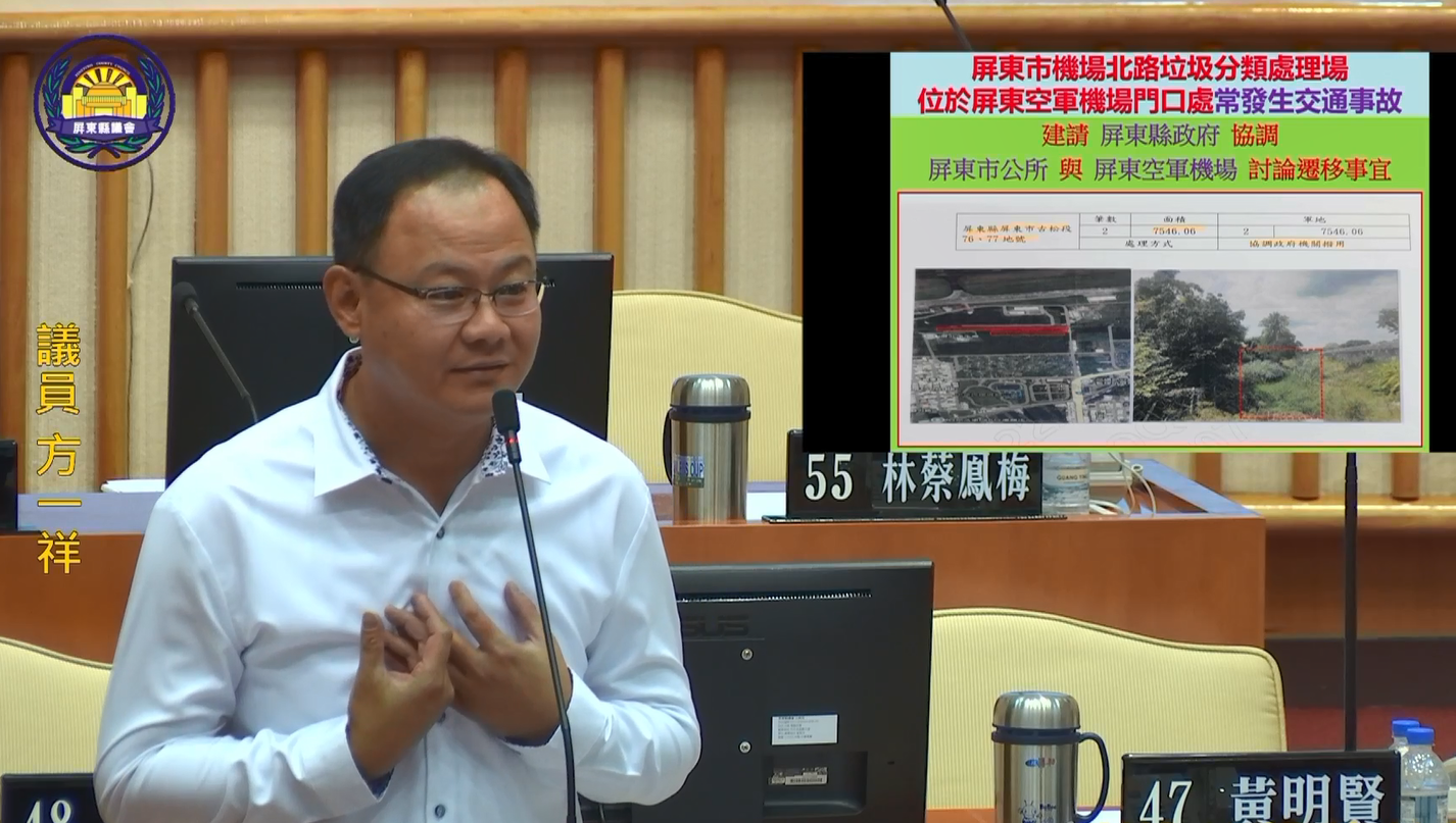 縣議員方一祥27日在議會質詢指出,垃圾場位於主要幹道,尖峰時段車流量龐大,過去已有嚴重交通事故案例。未來屏東科學園區、六塊產業園區及國際棒球場等設施完工後,周邊交通量勢必更為繁重,若垃圾場不遷移,恐加劇交通混亂並危及幼童安全,必須「未雨綢繆」。