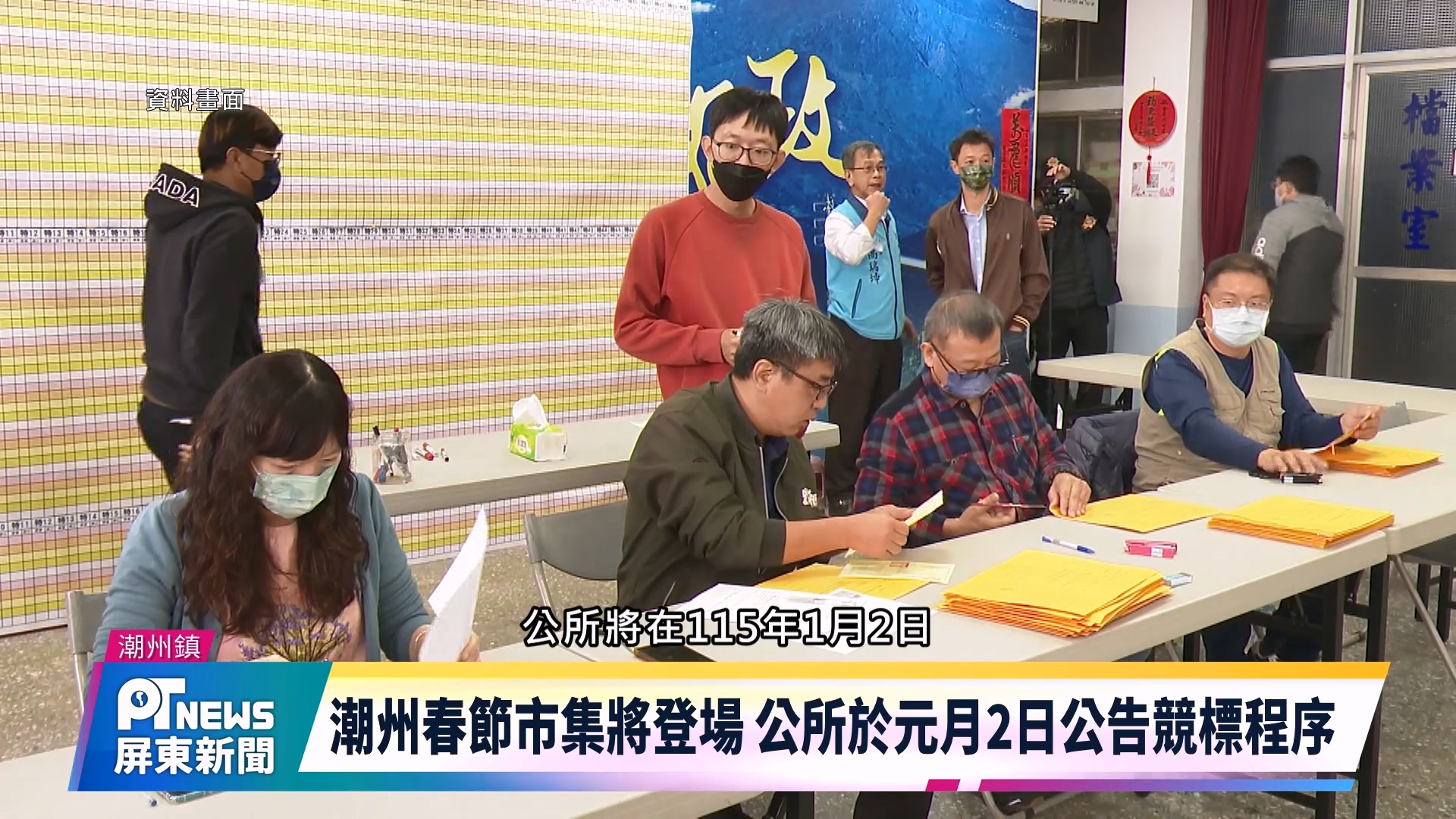 為辦理 115年2月16日到2月20日潮州春節假日市集,潮州鎮公所將在115年元月2日到元月15日辦理領標、投標作業,而一般區登記作業,也將於1月20日到1月22日在潮州體育館辦理登記作業,公所特別提醒,請有興趣參與特別競標或一般區登記的民眾,務必留意作業時間。