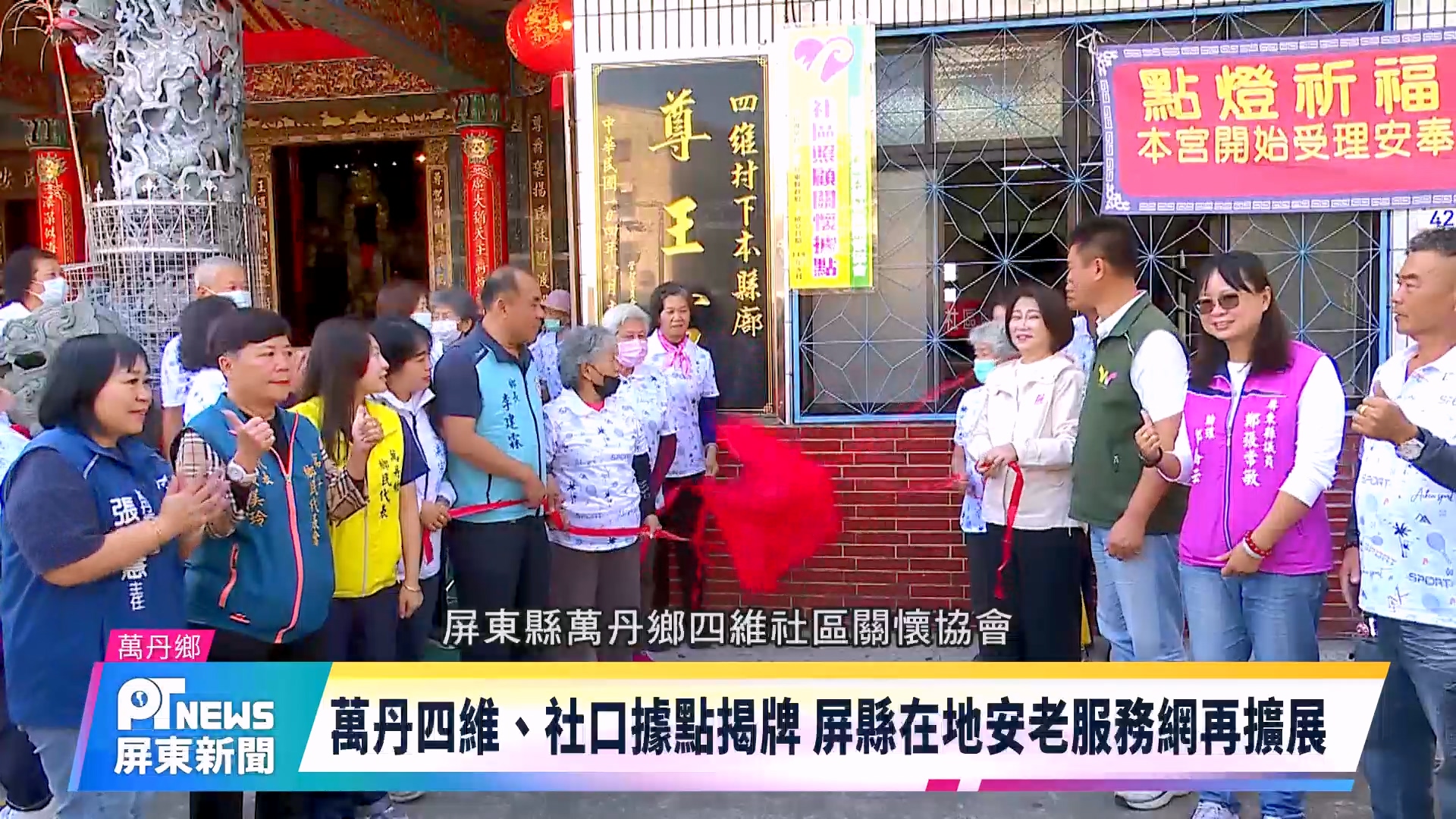 屏東縣老年人口比例持續增加,11月底全縣老年人口數已突破17萬人口,佔全縣總人口數21.77%。為讓長者在地安老,現在全縣443個村里,社區照顧關懷據點數量已達423處,其中萬丹鄉四維社區及社口社區,同日辦理社區照顧關懷據點揭牌,為屏東在地安老服務增添新能量。