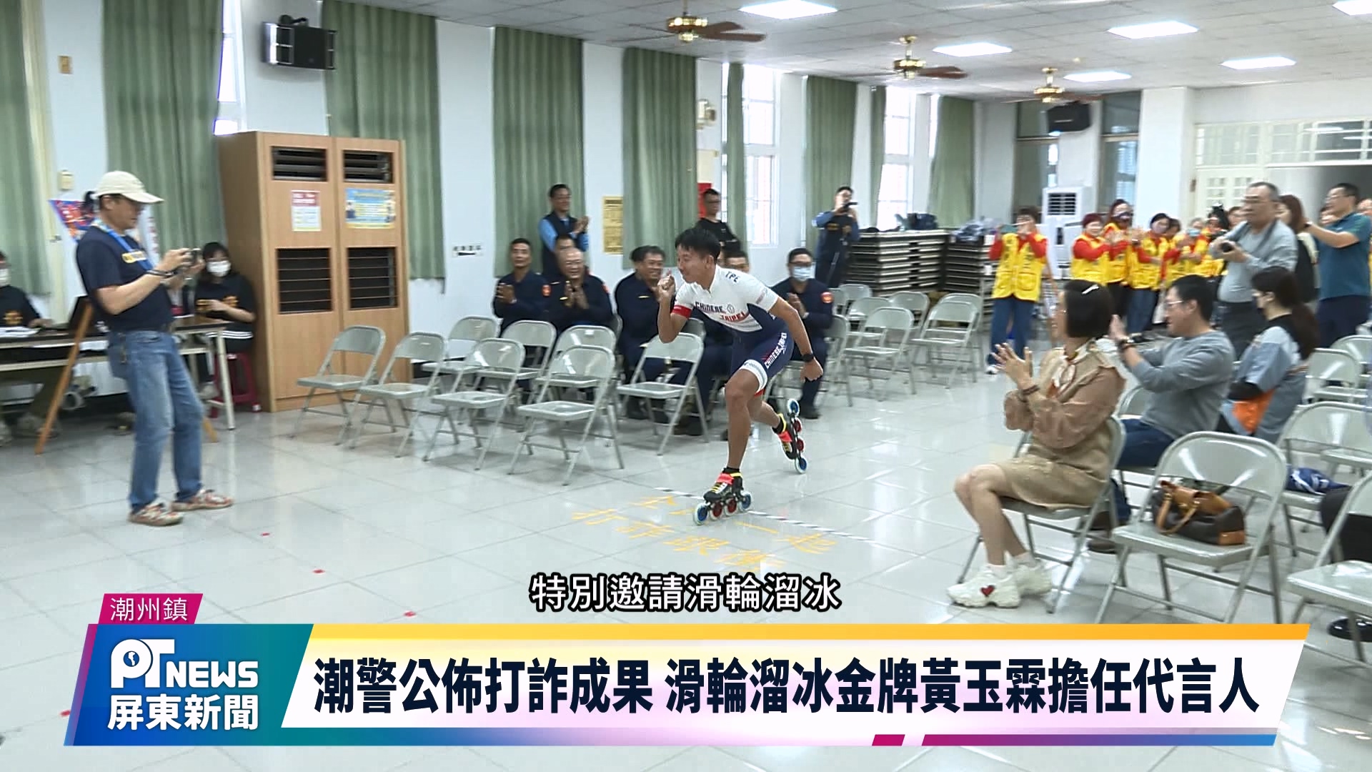 潮州警分局上午舉辦記者會公布打詐成果,更找來滑輪溜冰金牌國手黃玉霖擔任打詐代言人,期盼透過優質體育的「金牌精神」與百工百業力量,宣示跨域合作、全民防詐的行動決心,宣誓打詐的行動及目標。