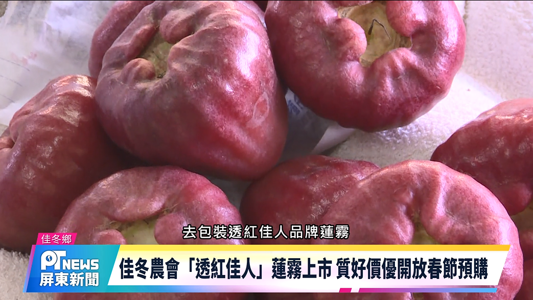 Home / 新聞 / 佳冬農會「透紅佳人」蓮霧上市 質好價優開放春節預購新聞佳冬農會「透紅佳人」蓮霧上市 質好價優開放春節預購2026-01-06 佳冬鄉著名的國宴等級「透紅佳人」蓮霧,陸續採收上市,今年不僅量產豐富、果品佳,甜度等級也相當高,目前農會正大量集貨包裝,並且搶先開放年節禮盒預購,晚來可就訂不到! Share this ArticlePrevious Article屏縣春節送暖活動啟動 7545戶低收家庭受惠Next Article潮州鎮急難救助金專戶 歲末挹注鎮內學校課輔費用ju.yin Related Posts 竹田豆油伯×瑪利亞快樂襪聯名 盼公益禮盒做愛心 2026-01-07 潮州十六號公園大蛻變 鎮民溫馨有感大讚環境佳 2026-01-07 鵬管處推轄區冬令遊程 四重溪泡湯還加碼送好禮 2026-01-07 Leave a Reply 取消回覆發佈留言必須填寫的電子郵件地址不會公開。 必填欄位標示為 *Comment顯示名稱 * 電子郵件地址 * 個人網站網址 在瀏覽器中儲存顯示名稱、電子郵件地址及個人網站網址,以供下次發佈留言時使用。