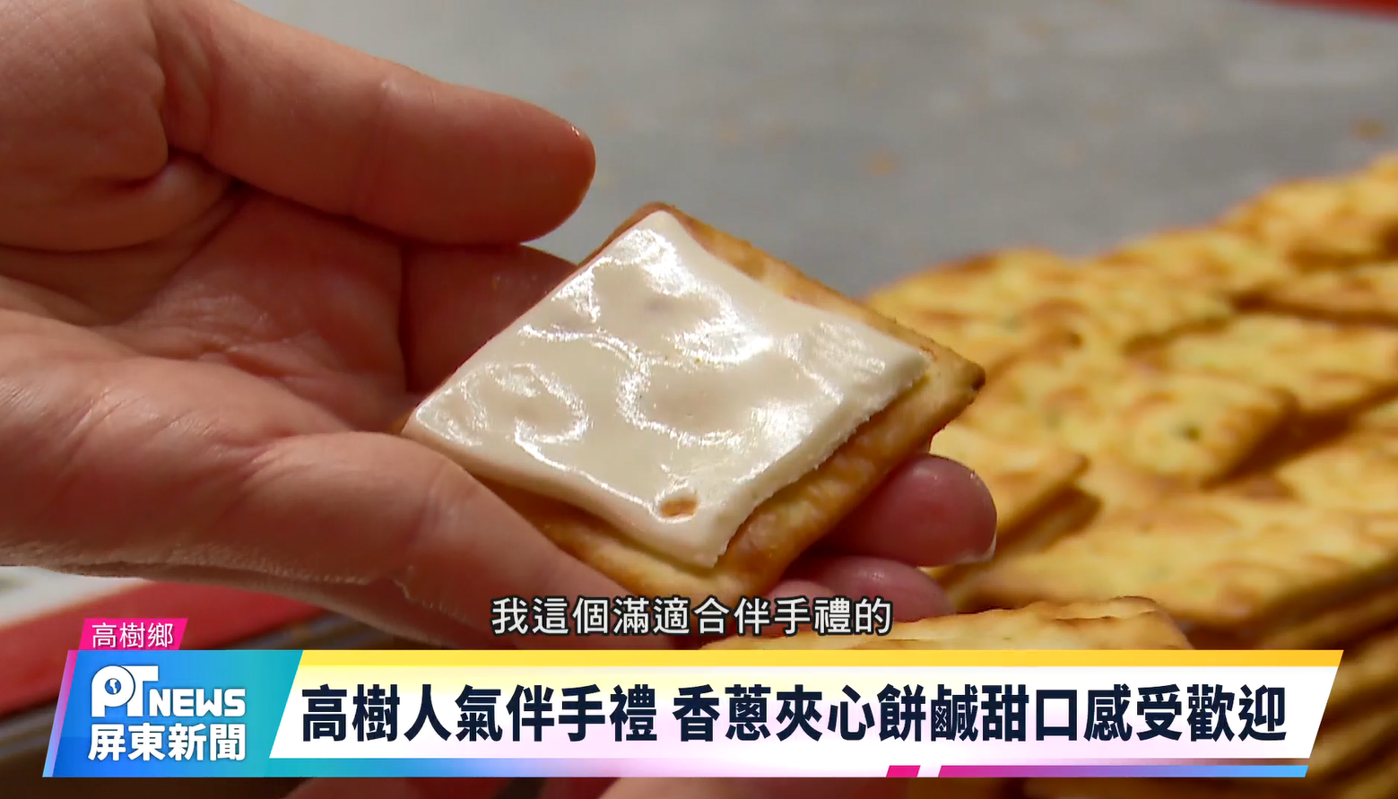 Home / 新聞 / 高樹人氣伴手禮 香蔥夾心餅鹹甜口感受歡迎新聞高樹人氣伴手禮 香蔥夾心餅鹹甜口感受歡迎2026-01-12 高樹鄉除了盛產蔬果,還有特色伴手禮「香蔥夾心餅」,酥脆鹹香的蘇打餅乾,夾著香甜不黏牙的牛軋糖,甜中帶鹹口感佳,在網路掀起團購熱潮,成為高樹代表性的在地點心。 Share this ArticlePrevious Article屏東啟動跨域守護網 三區共構防詐防暴Next Article高樹農會嚴選蜜棗口感脆甜度高 禮盒開放訂購ju.yin Related Posts 枋寮彩虹藝鐵「猛男鴨」出沒 烤鴨專賣超人氣 2026-03-03 潮州清明祭祀活動 大型法會供鄉親追思祭拜 2026-03-03 臺南至善基金會攜手屏科大 發表生命教育系列繪本 2026-03-03 Leave a Reply 取消回覆發佈留言必須填寫的電子郵件地址不會公開。 必填欄位標示為 *Comment顯示名稱 * 電子郵件地址 * 個人網站網址 在瀏覽器中儲存顯示名稱、電子郵件地址及個人網站網址,以供下次發佈留言時使用。