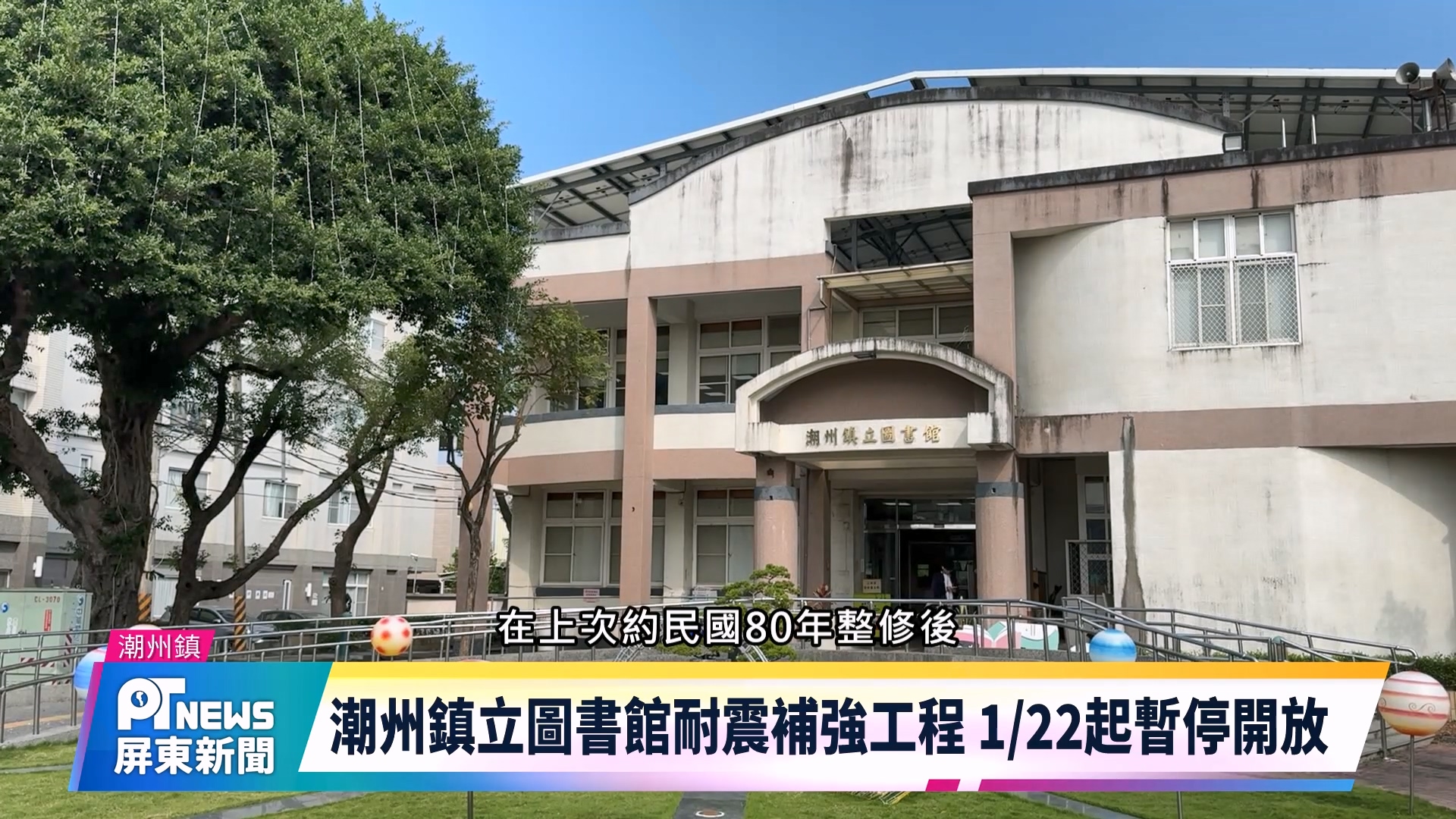 Home / 新聞 / 潮州鎮立圖書館耐震補強工程 1/22起暫停開放新聞潮州鎮立圖書館耐震補強工程 1/22起暫停開放2026-01-16 潮州鎮立圖書館建築老舊,雨季時常有漏水等情形,潮州鎮公所申請屏東縣政府經費補助,進行耐震補強工程,將從1月22日起暫停開放,K書中心則移到中山公園老人會館,工期大約三、四個月,屆時將提供鎮民更優質的閱讀環境。 Share this ArticlePrevious Article東港鵬村濕地推「聯名咖啡」大鵬灣手繪美景全收錄Next Article潮州春節假日市集競標 特區總金額突破500萬hedy.pu Related Posts 2026屏東燈節 規劃精彩表演及免費接駁服務 2026-01-16 潮州春節假日市集競標 特區總金額突破500萬 2026-01-16 東港鵬村濕地推「聯名咖啡」大鵬灣手繪美景全收錄 2026-01-16 Leave a Reply 取消回覆發佈留言必須填寫的電子郵件地址不會公開。 必填欄位標示為 *Comment顯示名稱 * 電子郵件地址 * 個人網站網址 在瀏覽器中儲存顯示名稱、電子郵件地址及個人網站網址,以供下次發佈留言時使用。