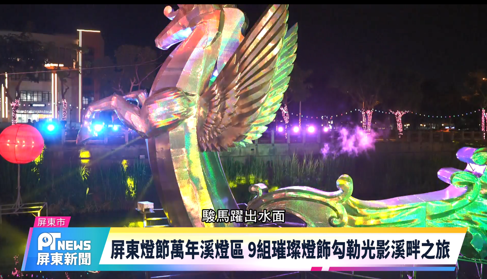 屏東燈節有四大燈區,屏東縣長周春米開箱屏東燈節萬年溪燈區,以「光馳萬年」為主題,將駿馬奔馳的意象轉化為流動光影,象徵奔向未來的希望與力量,沿著萬年溪規劃9組主題燈飾,並延伸至周邊節點,引領民眾展開一趟結合自然、生態與人文的光影旅程。