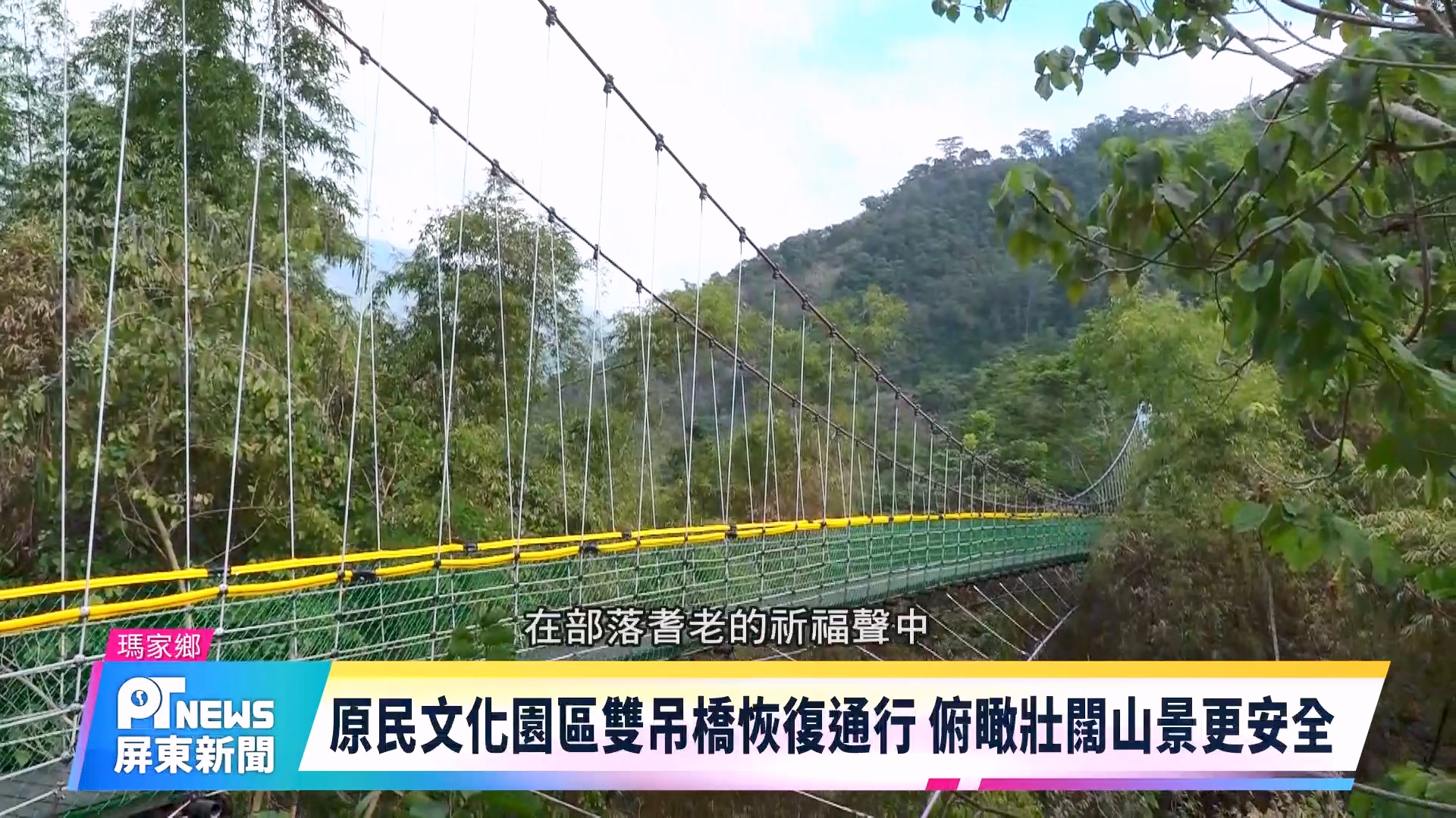 Home / 新聞 / 原民文化園區雙吊橋恢復通行 俯瞰壯闊山景更安全新聞原民文化園區雙吊橋恢復通行 俯瞰壯闊山景更安全2026-01-29 原住民文化園區是春節遊客走春的熱門景點,園區內的指標性景點彩虹橋「一號吊橋及二號吊橋觀流橋在整修後已正式通橋,將迎接春節期間的入園人潮, 歡迎遊客前來感受山林美景。 Share this ArticlePrevious Article屏市國運中心推銀髮樂齡課程 鍛鍊肌耐力延緩老化Next Article屏縣「雞湯送暖」號召各界共襄善舉關懷獨老tingshih Related Posts 潮州國小全民運動署國小聯賽奪冠 3月進軍全國賽 2026-01-29 屏縣「雞湯送暖」號召各界共襄善舉關懷獨老 2026-01-29 屏市國運中心推銀髮樂齡課程 鍛鍊肌耐力延緩老化 2026-01-29 Leave a Reply 取消回覆發佈留言必須填寫的電子郵件地址不會公開。 必填欄位標示為 *Comment顯示名稱 * 電子郵件地址 * 個人網站網址 在瀏覽器中儲存顯示名稱、電子郵件地址及個人網站網址,以供下次發佈留言時使用。