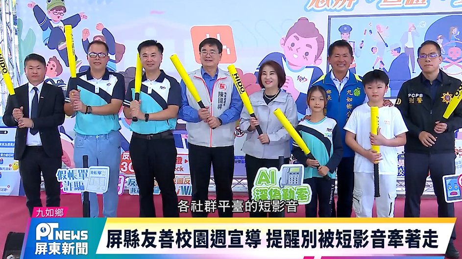 屏東縣政府為落實教育部友善校園政策推動,舉辦友善校園週宣導活動,這學期的主題是「拒絕短影音風險:別被演算法牽著走,思辨、查證、要求助!」,縣長周春米特別前往九如國小,帶領全體師生共同宣誓,展現屏東縣致力打造「零詐騙校園」的堅定決心。