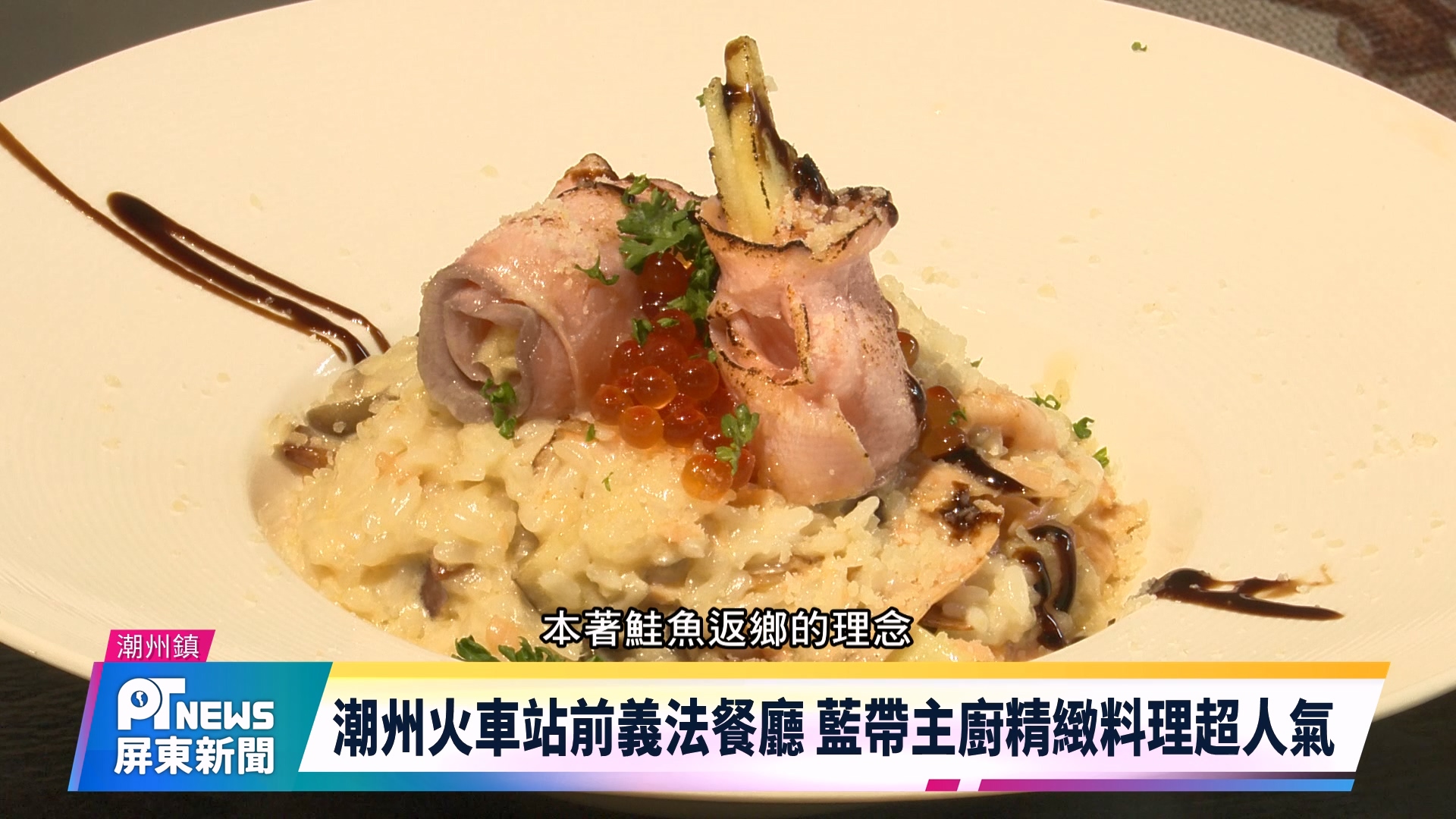 潮州火車站前一家義法餐館,業者林柏廷從日本藍帶廚藝學院學成歸國後,在外頭闖蕩了一段時間,本著好東西好料理應該留在家鄉的信念,返鄉創業,以鮭魚洄游般的心情,開發店家名菜「炙燒煙燻梅鮭奶油燉飯」成功引起關注。