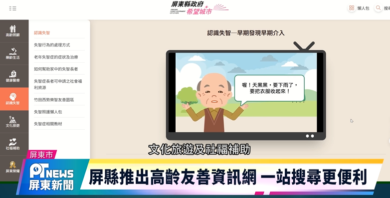 屏東縣政府為推動高齡友善城市,透過跨局處協調串聯長照處、衛生局、社會處等11個單位資料,彙整63篇高齡主題內容、20項懶人包及9部動畫影片,推出「高齡友善資訊網」,讓民眾在一站就能查詢到高齡照護、樂齡生活、健康醫療、認識失智、文化旅遊、社福補助等資訊,提升使用便利性與資訊可近性。