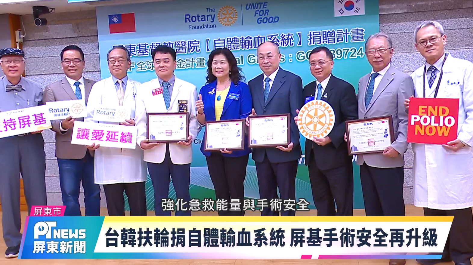 屏東基督教醫院醫療設備再升級!國際扶輪3510地區高雄扶輪社攜手韓國3740地區新堤川扶輪社,捐贈「自體輸血系統」,在屏基舉行捐贈儀式,透過跨國合作提升屏東急重症醫療量能。