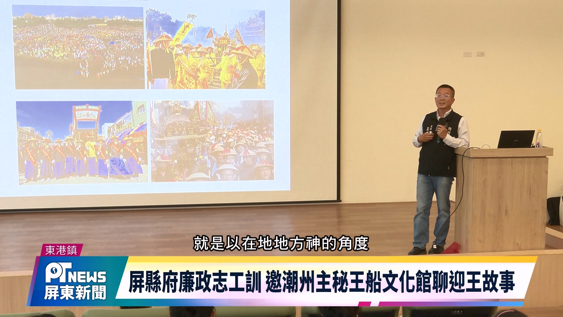 屏東縣政府政風處,選定東港鎮的屏東王船文化館場域,辦理年度廉政志工訓活動,特別邀請被在地鄉親譽為「迎王文化通」的潮州鎮公所主秘王建元,帶隊導覽,除了迎王文化解說,也透過大千歲的勸世榜文,親自向志工朋友說明,裡頭所蘊含的廉政理念,進而參悟如何讓廉政政風與推動越做越好。