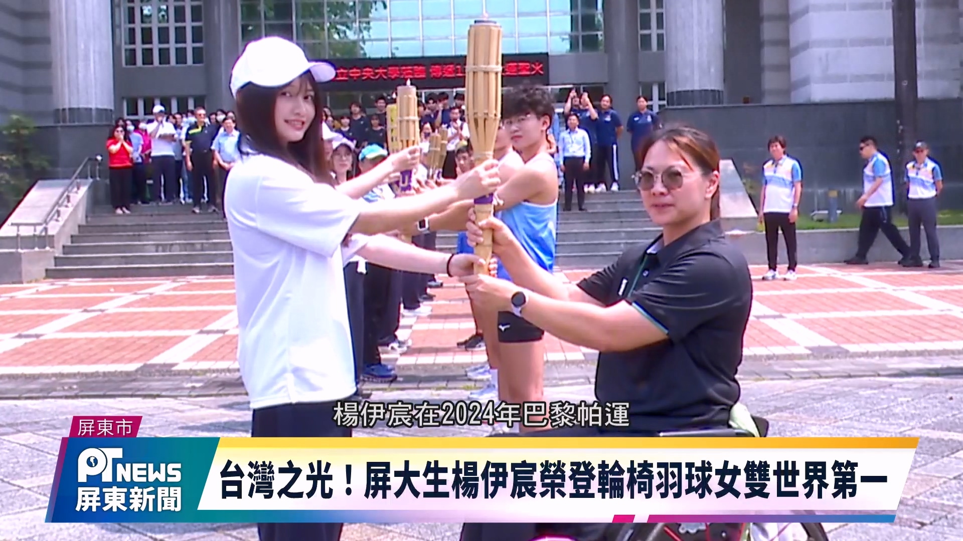 全國大專校院運動會聖火傳遞到屏東大學,出現了一位特別的焦點!她是目前就讀屏大體育系碩士班的楊伊宸,近日正式登上BWF輪椅女雙「世界第一」的寶座。楊伊宸從29歲受傷後跌入谷底,到如今攀上世界巔峰,她不僅用球拍翻轉人生,現在更重拾書本,要把這份力量分享給更多人。