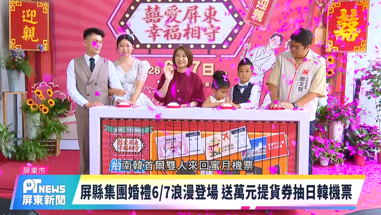 屏東縣政府年度盛事「集團婚禮」將於6月7日在屏東縣民公園C倉庫溫馨登場,今年以「囍愛屏東,幸福相守」為主題,縣除提供萬元提貨券與專業婚紗造型服務外,婚禮當日更將抽出日本東京、南韓首爾雙人來回蜜月機票,並贈送夏都住宿券及總價值6萬元之家電禮品,活動將於4月28日上午10時開放線上報名,想參加的新人們手腳可要快一點。