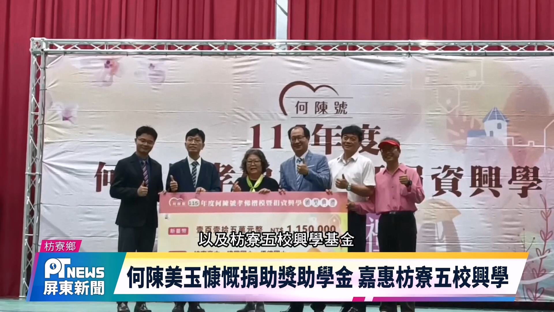 為了回饋鄉里,出生枋寮的何陳美玉女士,長年投入孝悌教育與公益助學,今年特別捐贈新臺幣 115 萬元的獎助學金,除了提倡孝道,表揚枋寮五校的孝悌楷模學生,也將款項運用在學校興學基金,希望這善行義舉能為社會注入穩定而持久的正向力量。