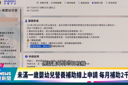新聞未滿一歲嬰幼兒營養補助線上申請 每月補助2千元屏東縣未滿一歲嬰幼兒營養補助今年上路,申請相當踴躍,不到一個月縣府社會處就收到2600多件申請,陸續審核中,為...hedy.pu2026-01-27 Read More