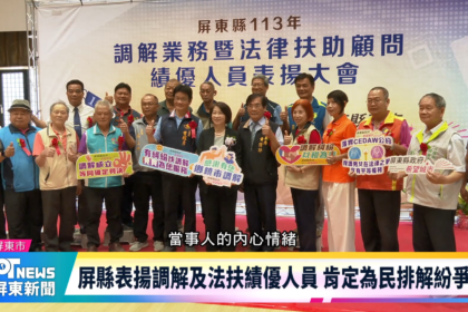新聞屏縣表揚調解及法扶績優人員 肯定為民排解紛爭屏東縣政府舉辦「鄉鎮市調解及法律扶助業務績優人員表揚大會」,共有26個績優單位及105名績優人員獲獎。縣長周春...ju.yin2025-09-30 Read More