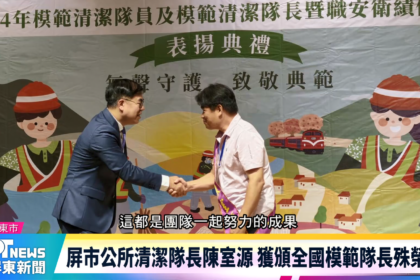 環境部從全國368個清潔隊長中,遴選出10位「全國模範清潔隊長」,屏東市清潔隊長陳室源獲得這個殊榮,市長周佳琪...